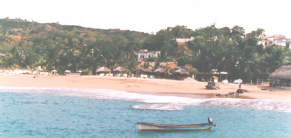 As you drive into Puerto Angel, the first beach you will see is Playa Principal. In the mornings, much activity is centered around the pier where fishing boats are arriving with their catch. Tuna is probably the most common (Try a real tuna fish salad at one of the restaurants.), also red snapper, shark, bonito, sailfish, lobster, conch, octopus, and many others. Tuna and lobster will not be as plentiful when the water temperature is higher. The old concrete pier, which really sits too high above the waterline to be of much use for unloading the boats, was built before there were paved roads in the area for the purpose of shipping coffee. The pier was refurbished in 1999. There are several restaurants along the beach and a small naval installation.