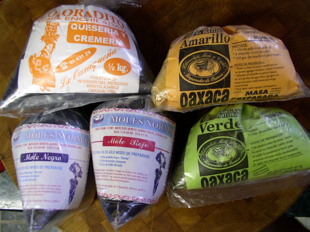 Cut the turkey into 16 pieces and parboil in a large pot with salt. Add the chopped pork and continue cooking until the meats are done. Roast the chiles in a frying pan being careful not to scorch them. Remove the seeds and membranes and roast them on the dry tortilla until they are charred. It is important that there be no burned seeds or membranes because this will make the mole bitter. Next, put the chiles, seeds, and membranes in a casserole dish and soak in hot water, trying not to include pieces of the burnt tortilla. Toast the nuts and sesame seeds separately. Add the cloves, sauteed garlic, marjoram, cinnamon, pepper, chiles, and the almoraduj. Grind these together with the tomatoes to form a homogeneous paste. Heat the lard and fry the mixture. Add the meat and its broth and reduce until thickened. Season with salt to taste. Finally, add the leaves (whole), chocolate, and sugar. Stir constantly over the heat for awhile and the dish is ready to serve.