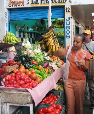 Once prepared with this knowledge, we all embarked on a shopping trip to the well-known marketplace, Mercado de La Merced, armed with multhued bolsas – market bags – to carry the compras – purchases. Pili had readied a partial shopping list, but, she advised us, she always adds "surprises," such as fresh foodstuffs which peasant women from the mountains sometimes bring down.