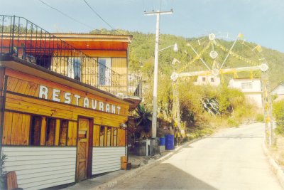 ![]() The Restaurante Rayita del Sol (above), is located right on the highway. This is where the town's only telephone is. You can make reservations at the town's hotels and arrange tours, etc., by calling (951) 547-4225 or (951) 572-0111. At right is the view off the back patio of the Rayita del Sol, of scattered elements of the town.