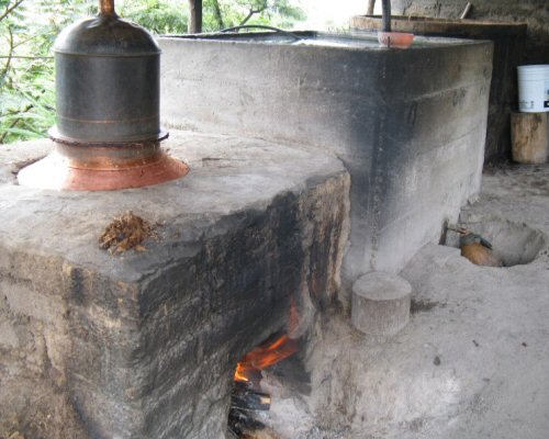 The copper still is comprised of two principal parts joined by copper tubing, each usually encased in a square receptacle made of clay brick, mud and cement, or any combination. One side consists of an oven fuelled by firewood which heats the large enclosed copper pot; the other is a copper serpentine immersed in a tank of water, with a spigot at the bottom. The copper tubing joins the pot to the serpentine.