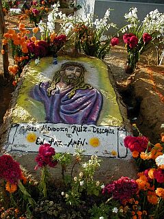 This is one plot in the vast "new" cemetary in Xoxocotlán (ho-ho-coat-LAN), a suburb of Oaxaca city. This picture shows a little bit of the decoration and devotion that Oaxaqueños lavish on the graves of their departed. When the sun sets, the families will gather in this graveyard, and many will remain until 5:00 a.m. when the holiday officially ends, talking, drinking and keeping company with their dead. [Photo by Diana Ricci]