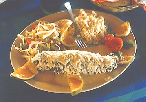 Rollo de Mar is what this dish is called. There are a number of restaurants on the beach at Tenacatita and they all serve this specialty. This one was prepared at Restaurante Chito. This is a fish filet stuffed with chopped shrimp and octopus in an almond sauce, wrapped completely in bacon and covered with more almond cream sauce. It is a rich and flavorful dish, just wonderful.