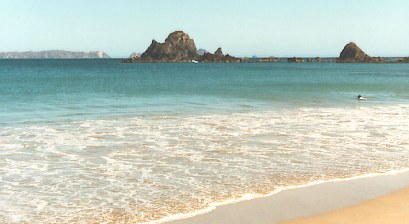 | Tenacatita, like several other little towns in this area, has a beautiful, tranquil, gently sloping beach. On the day these pictures were taken, the winds were strong which made the waves high in other places yet it remained calm here. |