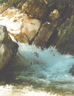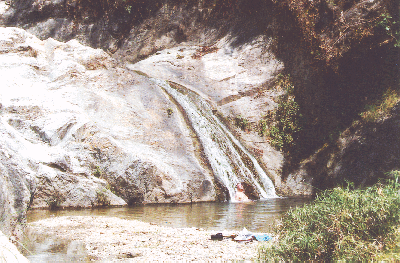 This waterfall and pool is located about 3 miles north of Chacalapa on Hwy 175. The stream runs under the highway where the road bends to the left at GPS: 15°51.814'N 96°28.125'W (km 219). You can drive off the road to the right and park by the stream and walk a short distance upstream to this spot. There are several small pools and waterfalls.