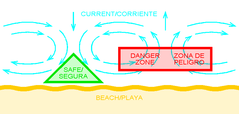 The currents at Zipolite and nearby beaches have been reported to travel in circular patterns such as shown above. Adjacent circular flows travel in opposite directions so that there are areas where swimmers will be drawn out to sea or pushed toward the shore. To avoid the danger zone, enter shallow water and determine which way the current flows along the beach. Make your way against the current, remaining in shallow water, until there is no more current along the beach. This area should be relatively free of currents that would draw you away from shore.