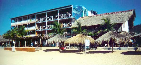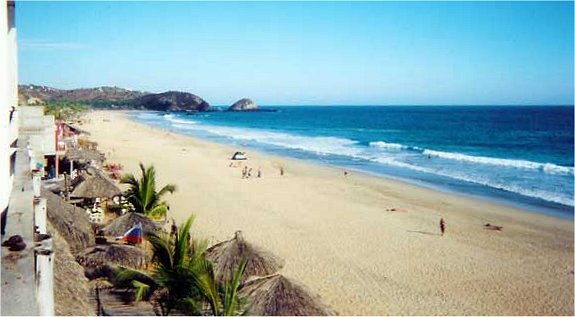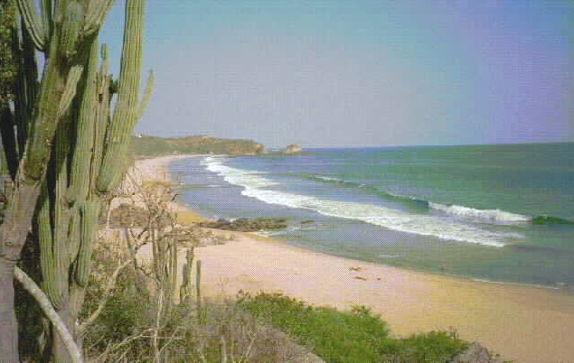 Zipolite beach taken from Brisa Marina, looking east toward Playa los Amores. Submitted by Cathie Leavitt (3/03)